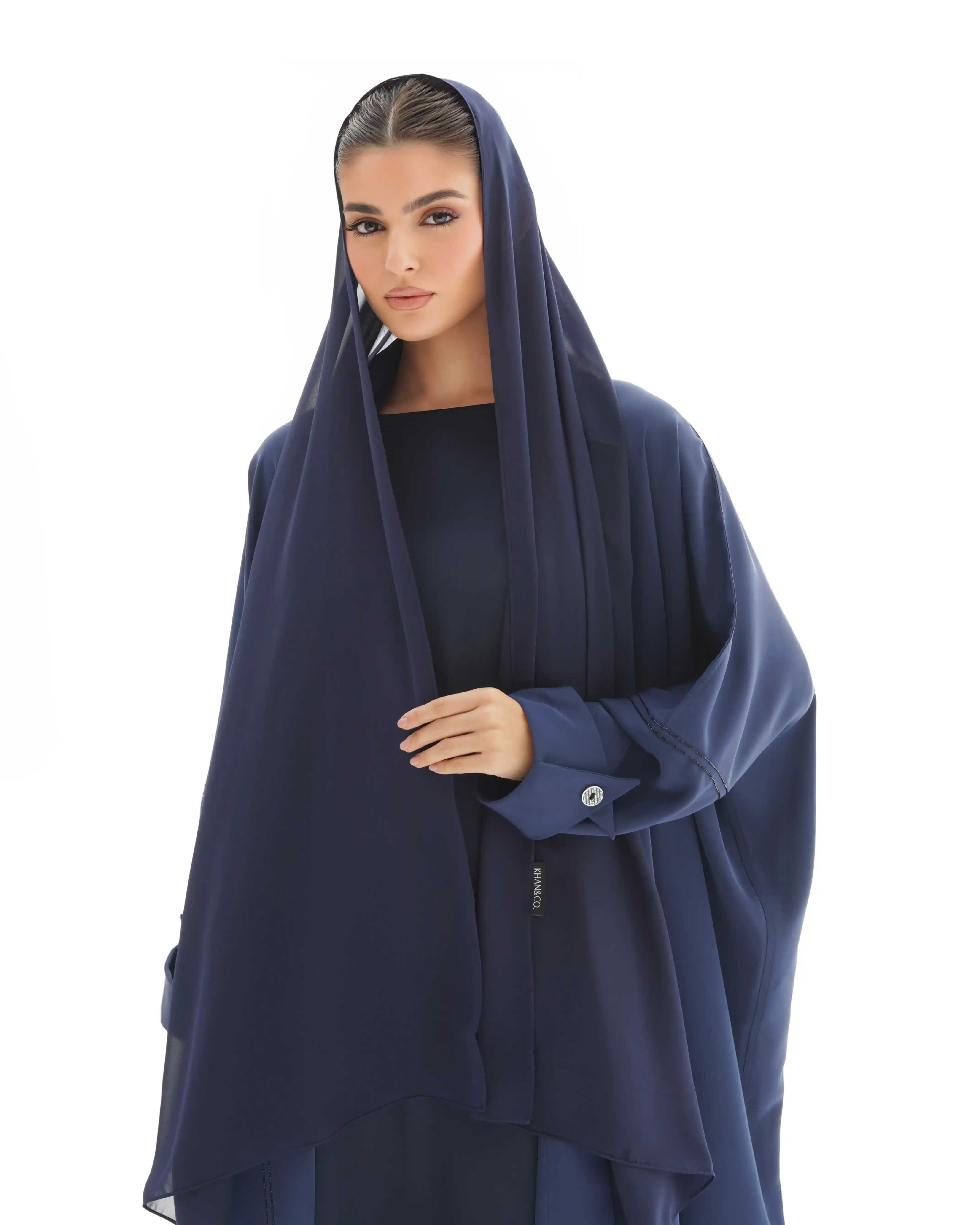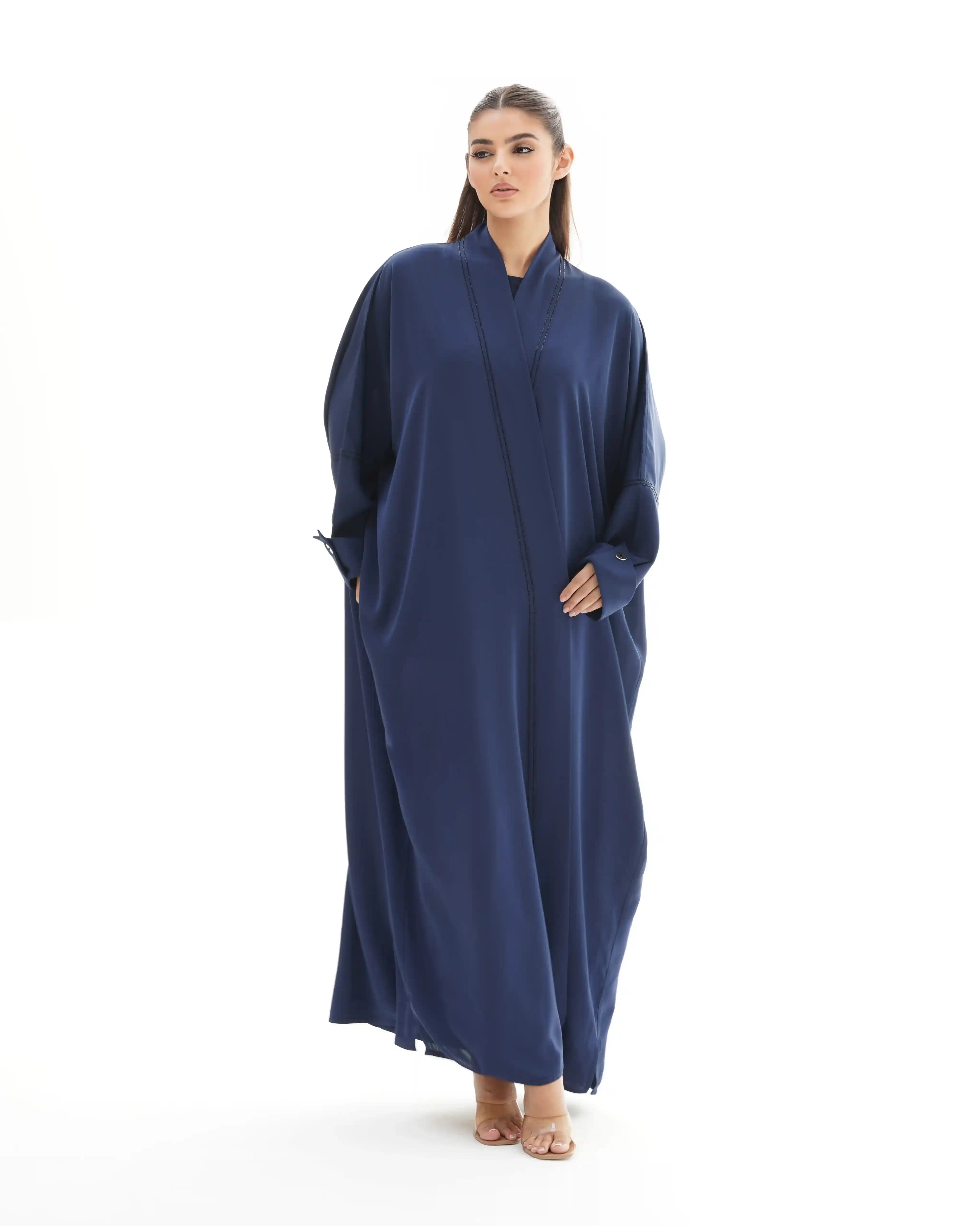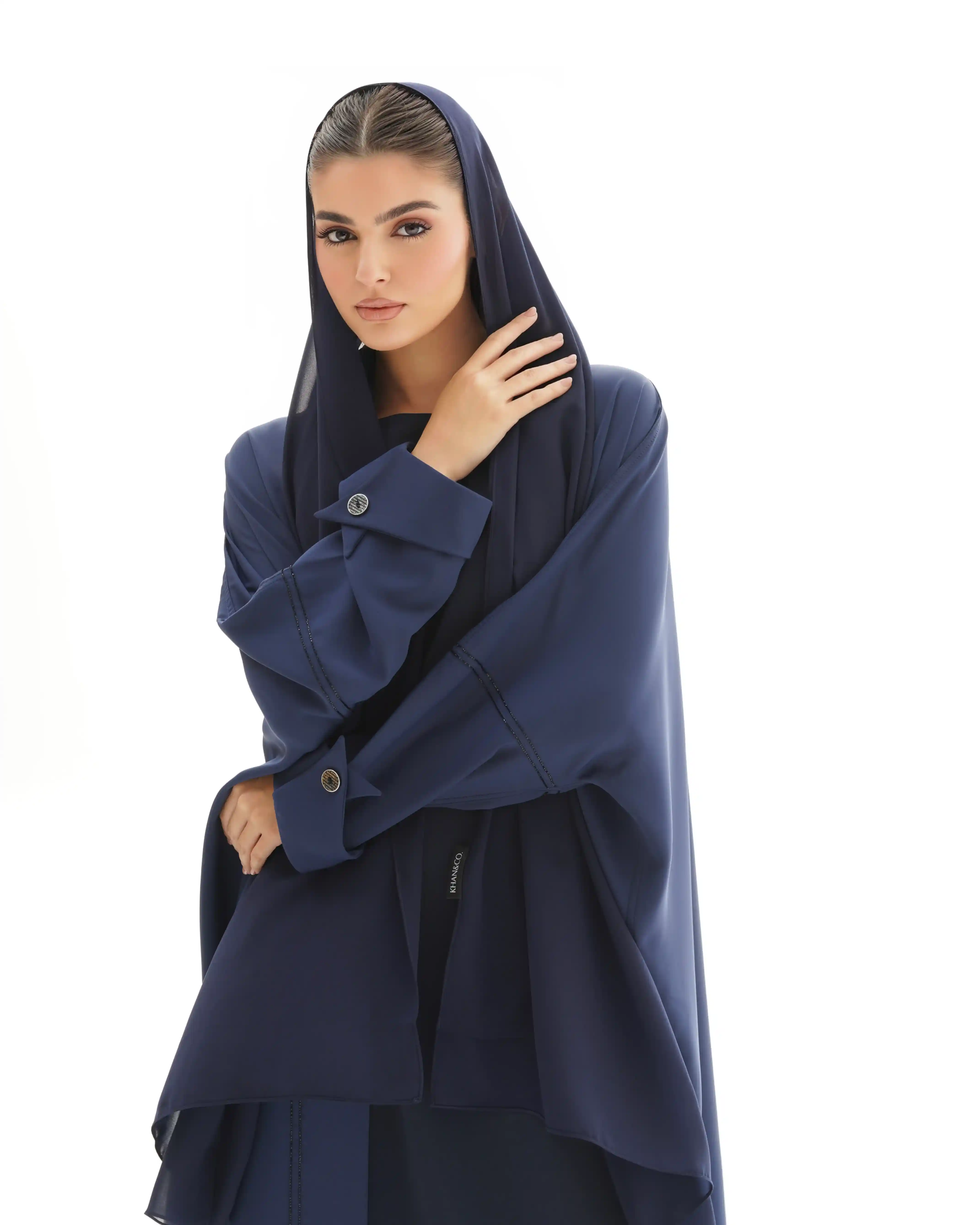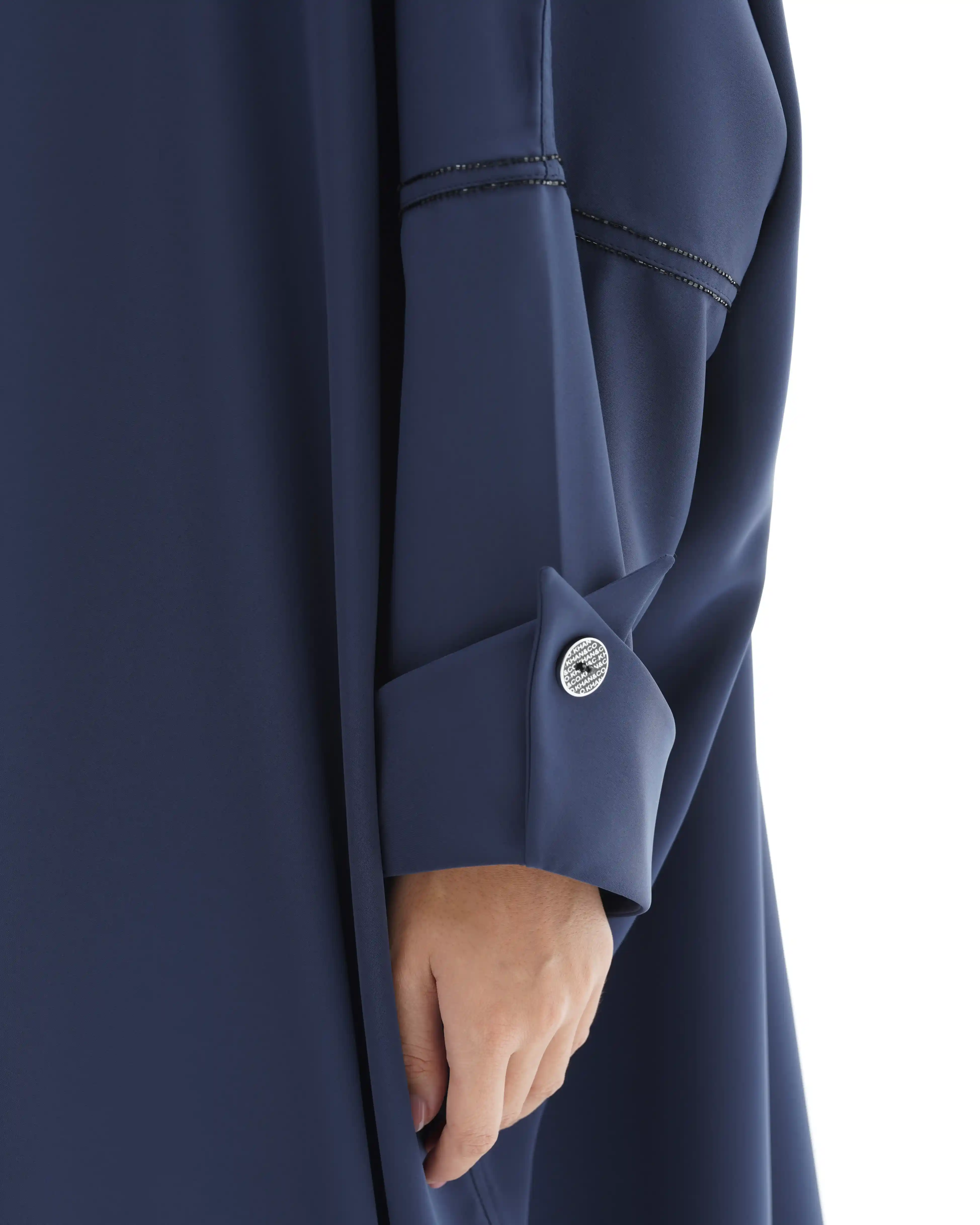 تضيف التفاصيل الأنيقة لمسة عصرية جذابة إلى هذه العباية المصنوعة من قماش الكريب الخفيف والمنسدل مما يمنحها إطلالة مفضلة كلاسيكية ،اكتملت بخطوط دقيقة وناعمة من الخرز الاسود اللامع تبدأ من خلف شريط الرقبة إلى اسفل ذيل العباية وتزدان الأكمام بقلبة قماش وقصة مستوحاة من كلاسيكيات الازياء الفرنسية وبإزرار بعلامة .KHAN&CO الايقونية مثبته بحبات من الخرز الاسود.