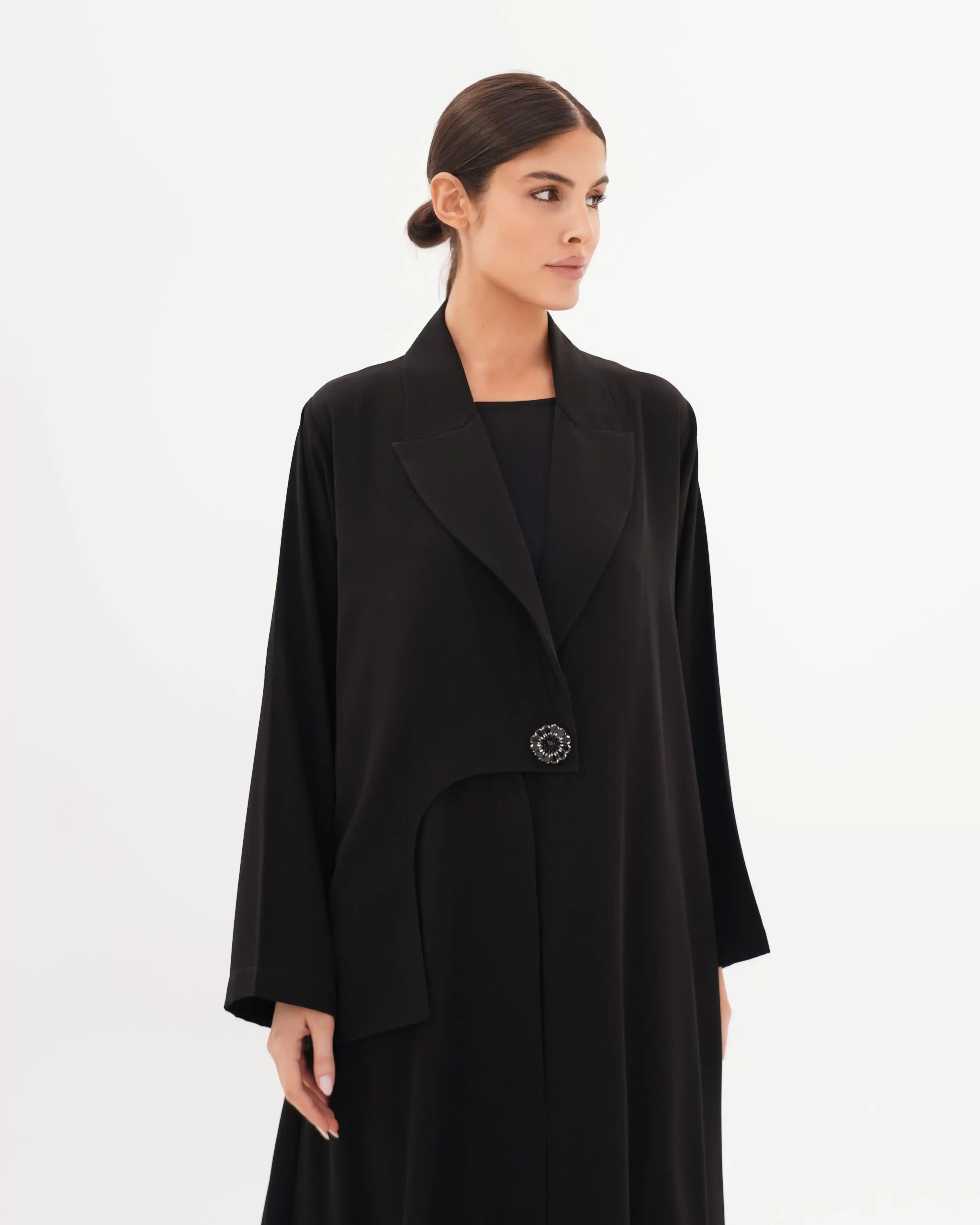 عباية بتصميم أنيق يقوم على نقاء الخطوط وفخامة التفاصيل الهادئة، تنسدل بقصّة مستقيمة بانسيابية متوازنة. صُنعت من قماش سلكتف كريب بملمس ناعم وانسدال خفيف يعزّز رقي الإطلالة. يتميّز التصميم بعنصر كريستالي دائري منفرد على الصدر، مستوحى من شكل زهرة دقيقة بلمعة معدنية راقية، يمنح العباية توقيعًا بصريًا واضحًا دون مبالغة. تأتي بياقة بليزر ناعمة بخطوط مستقيمة مفتوحة مع إغلاق مخفي، تحافظ على بساطة التصميم وتبرز جمال التفاصيل بدقة وأناقة.