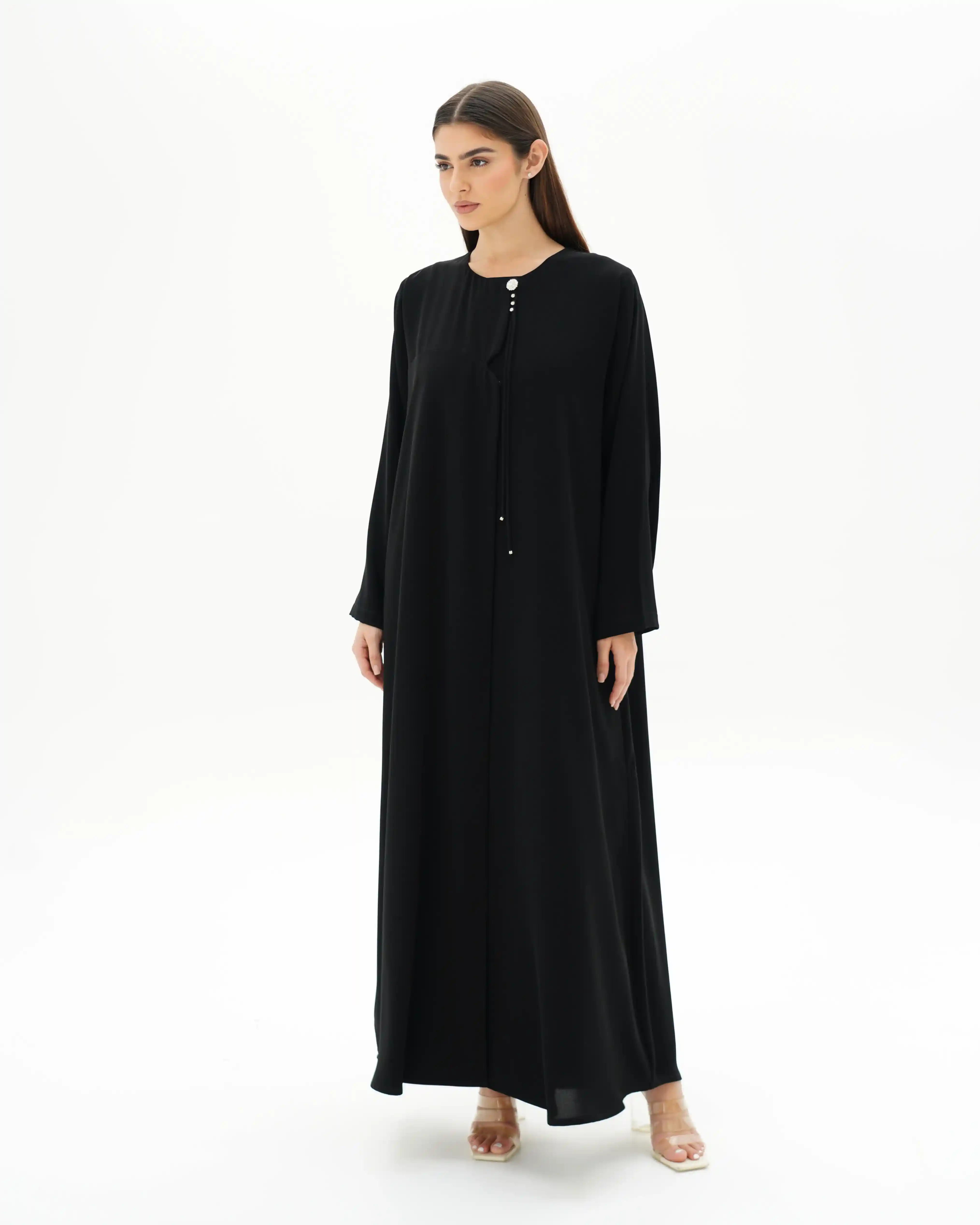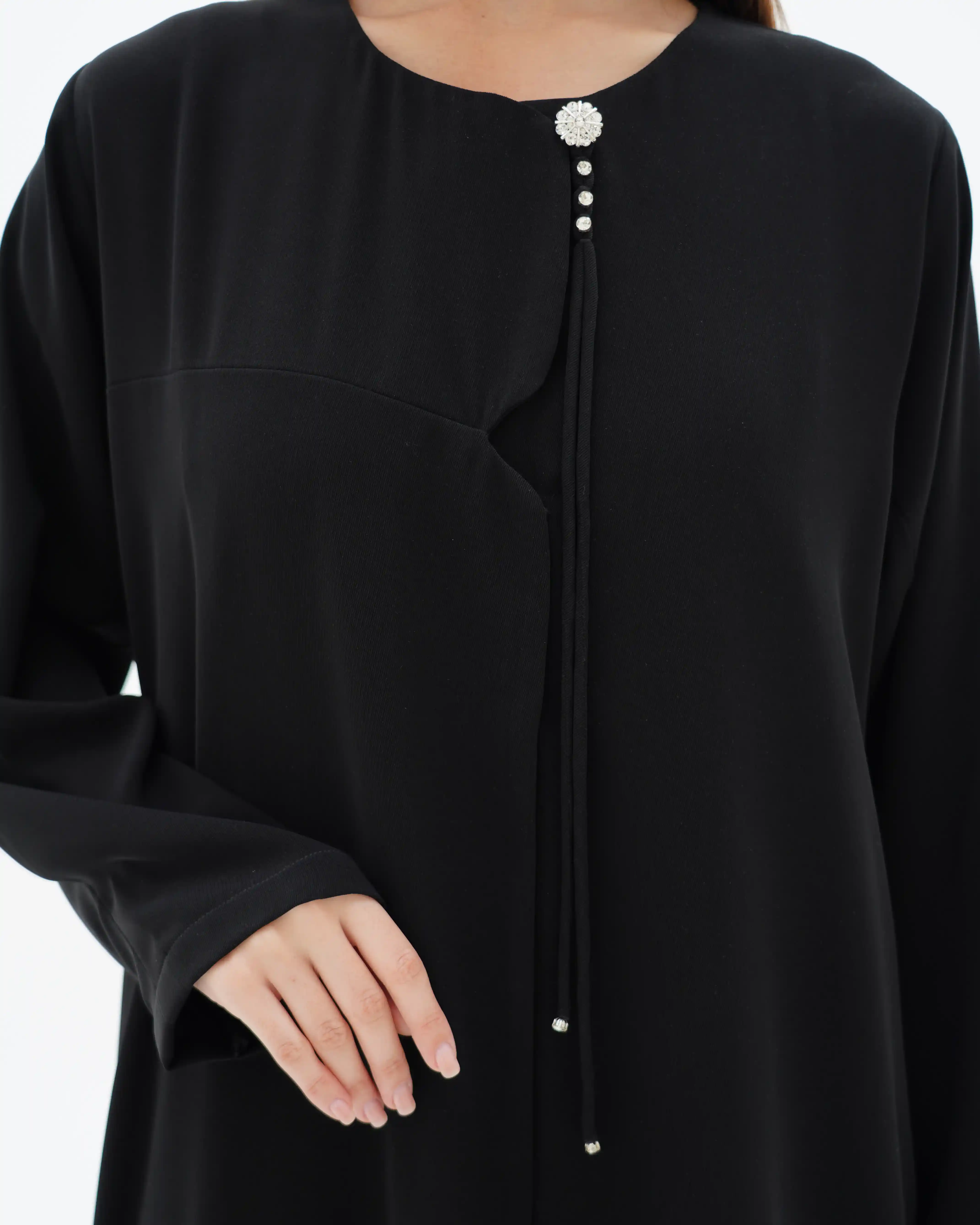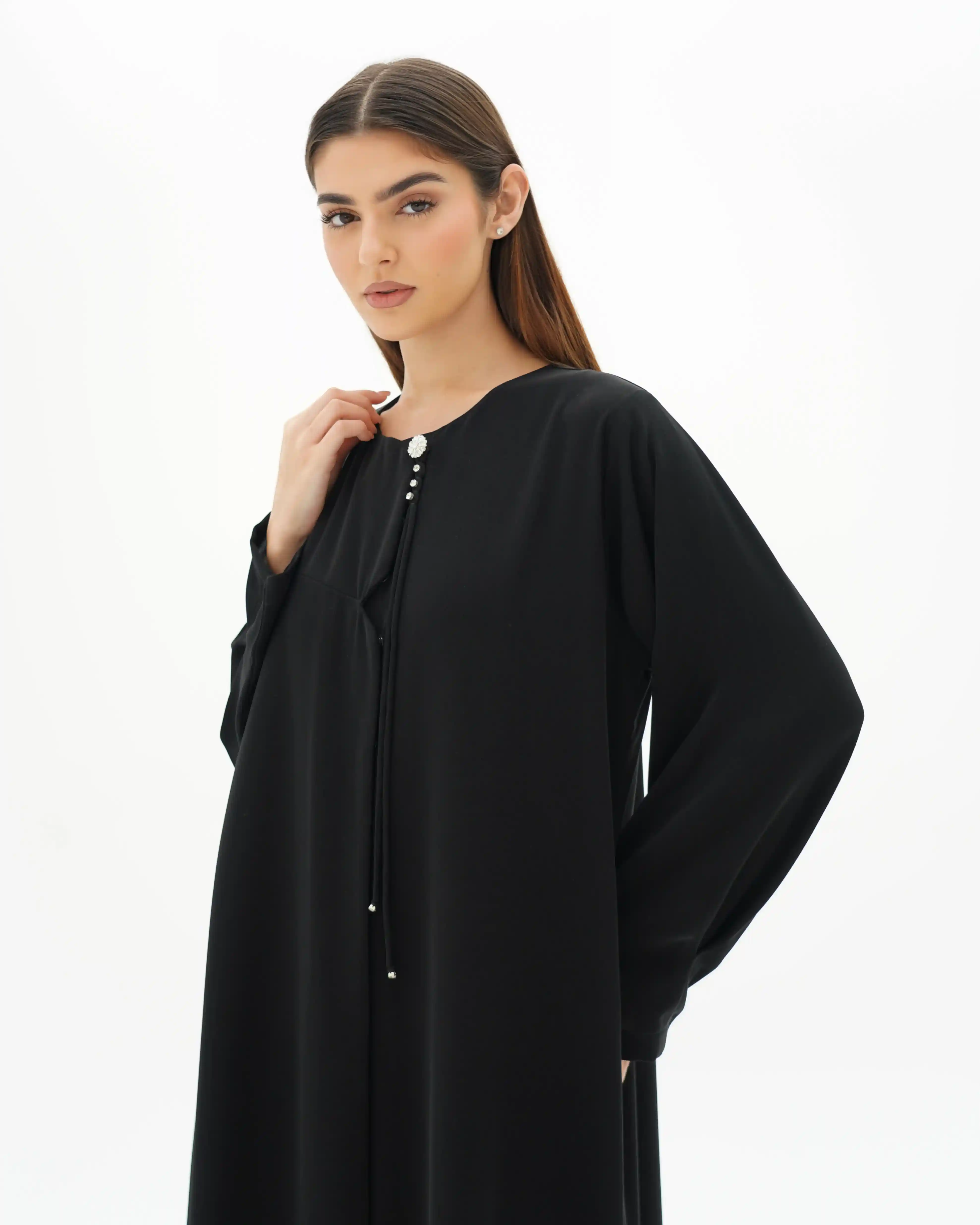 عباية تنسدل بقصّة مستقيمة، من قماش سلكتف كريب بملمس ناعم وانسيابية متزنة. يأتي الإغلاق الأمامي بطقطق كامل مخفي ليحافظ على نقاء الخط الأمامي، بينما يتوسط الصدر ثنية ناعمة تضيف بُعدًا بصريًا هادئًا. تتزّين الياقة باشتغال فاخر من زركون والكريستال بتكوين دائري متناغم، يتصل بحزام منسدل مرصّع في بدايته بثلاث خرزات فضية تتوسطها خرزة بيضاء، على امتداده بعُقد دقيقة، وينتهي بتفصيل كرستالة فضي يمنحه لمسة لامعة محسوبة. الأكمام بثنيات مدروسة. وتكتمل الإطلالة بطرحة متناغمة مزدانة بخمس لآلئ مستوحاة من تفاصيل الياقة والحزام المنسدل، لتجسّد تناغمًا متكاملًا في التفاصيل.