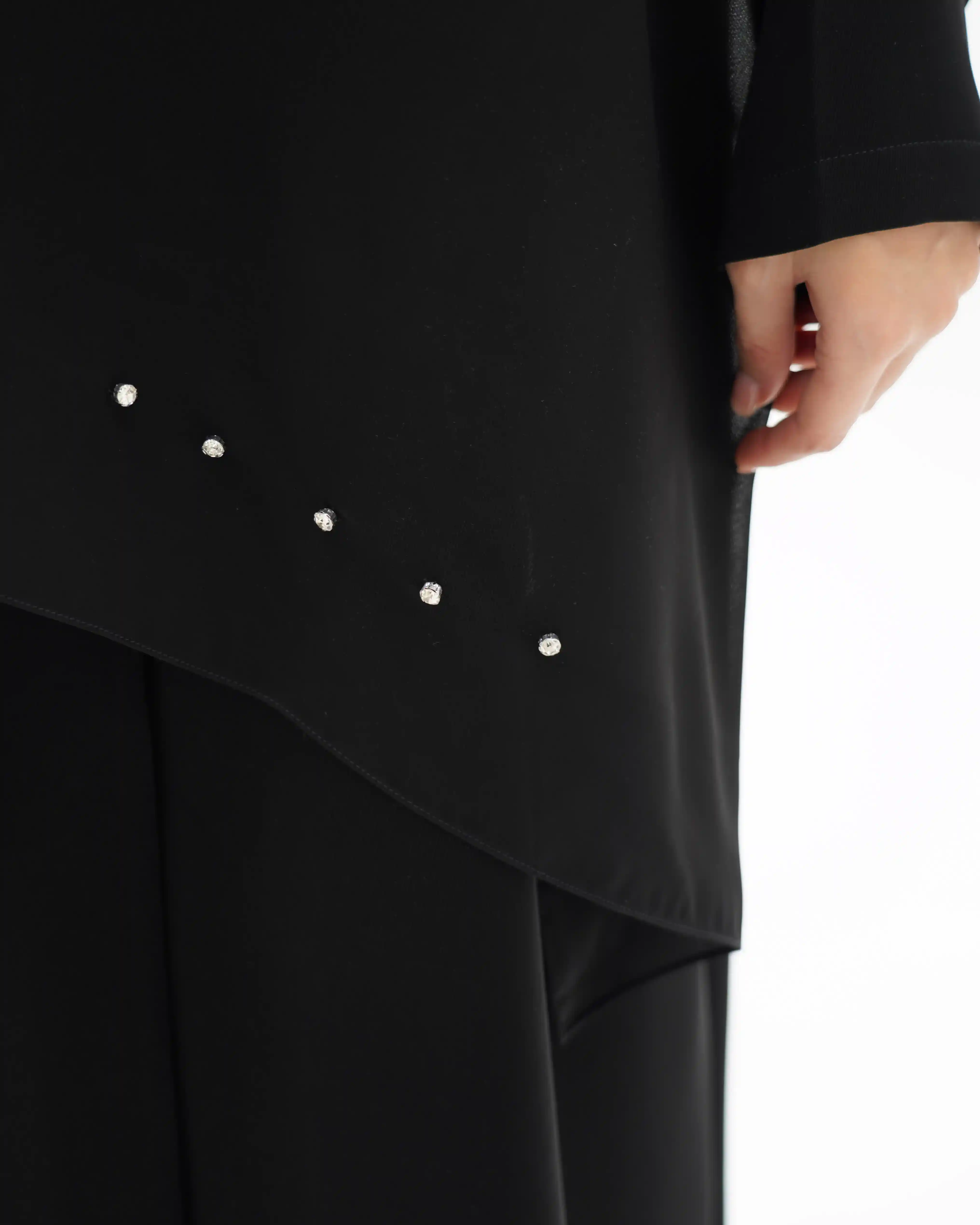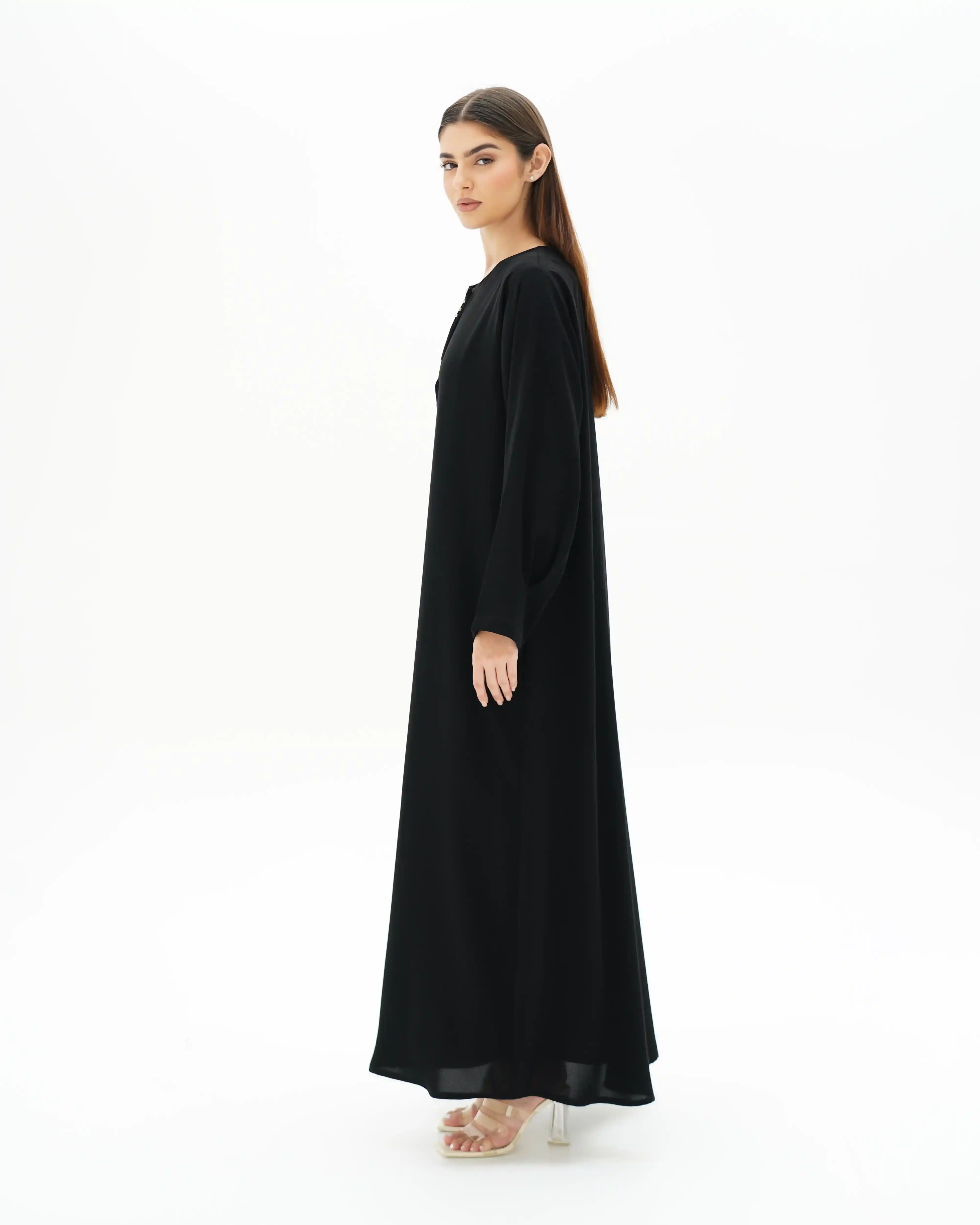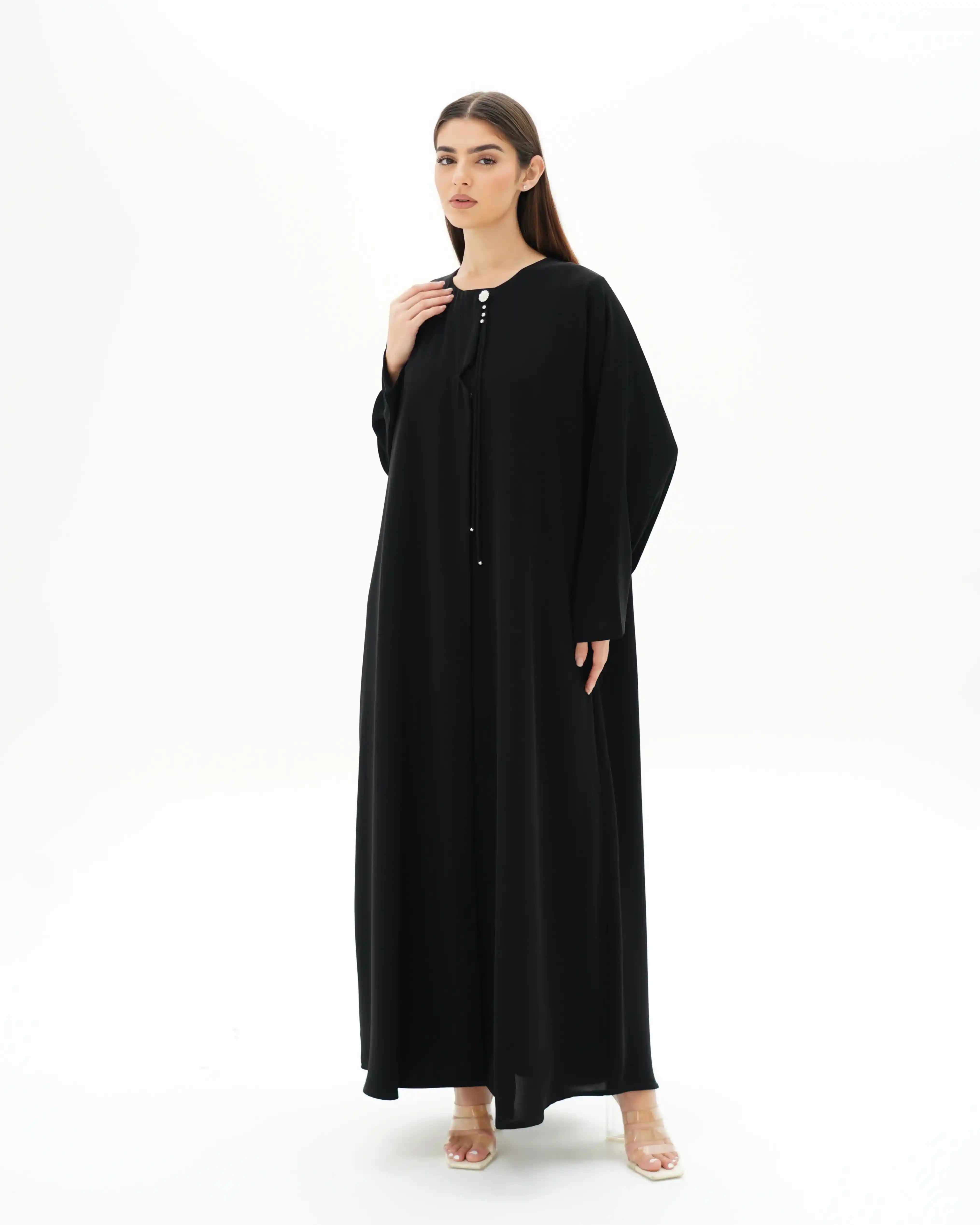 عباية تنسدل بقصّة مستقيمة، من قماش سلكتف كريب بملمس ناعم وانسيابية متزنة. يأتي الإغلاق الأمامي بطقطق كامل مخفي ليحافظ على نقاء الخط الأمامي، بينما يتوسط الصدر ثنية ناعمة تضيف بُعدًا بصريًا هادئًا. تتزّين الياقة باشتغال فاخر من زركون والكريستال بتكوين دائري متناغم، يتصل بحزام منسدل مرصّع في بدايته بثلاث خرزات فضية تتوسطها خرزة بيضاء، على امتداده بعُقد دقيقة، وينتهي بتفصيل كرستالة فضي يمنحه لمسة لامعة محسوبة. الأكمام بثنيات مدروسة. وتكتمل الإطلالة بطرحة متناغمة مزدانة بخمس لآلئ مستوحاة من تفاصيل الياقة والحزام المنسدل، لتجسّد تناغمًا متكاملًا في التفاصيل.