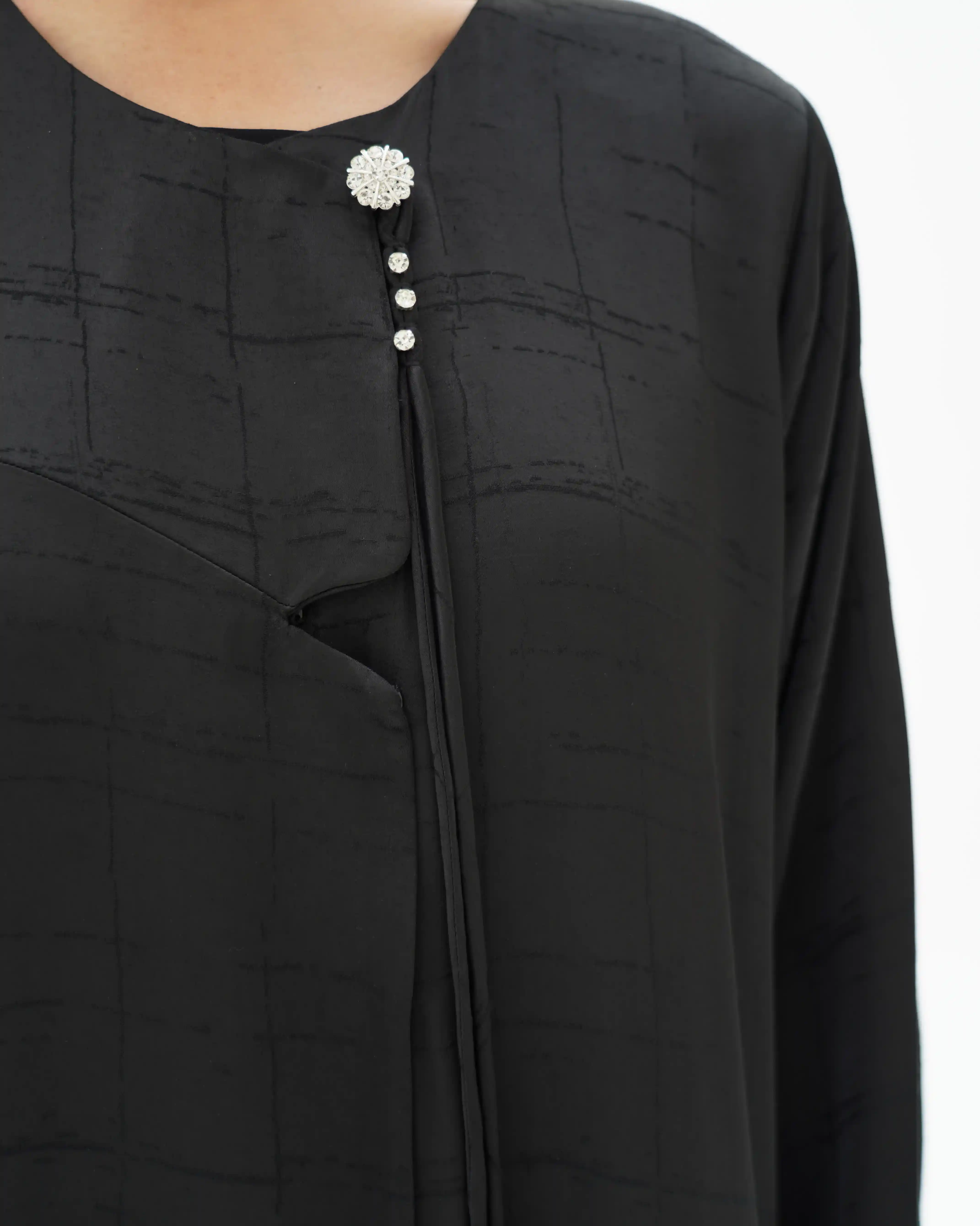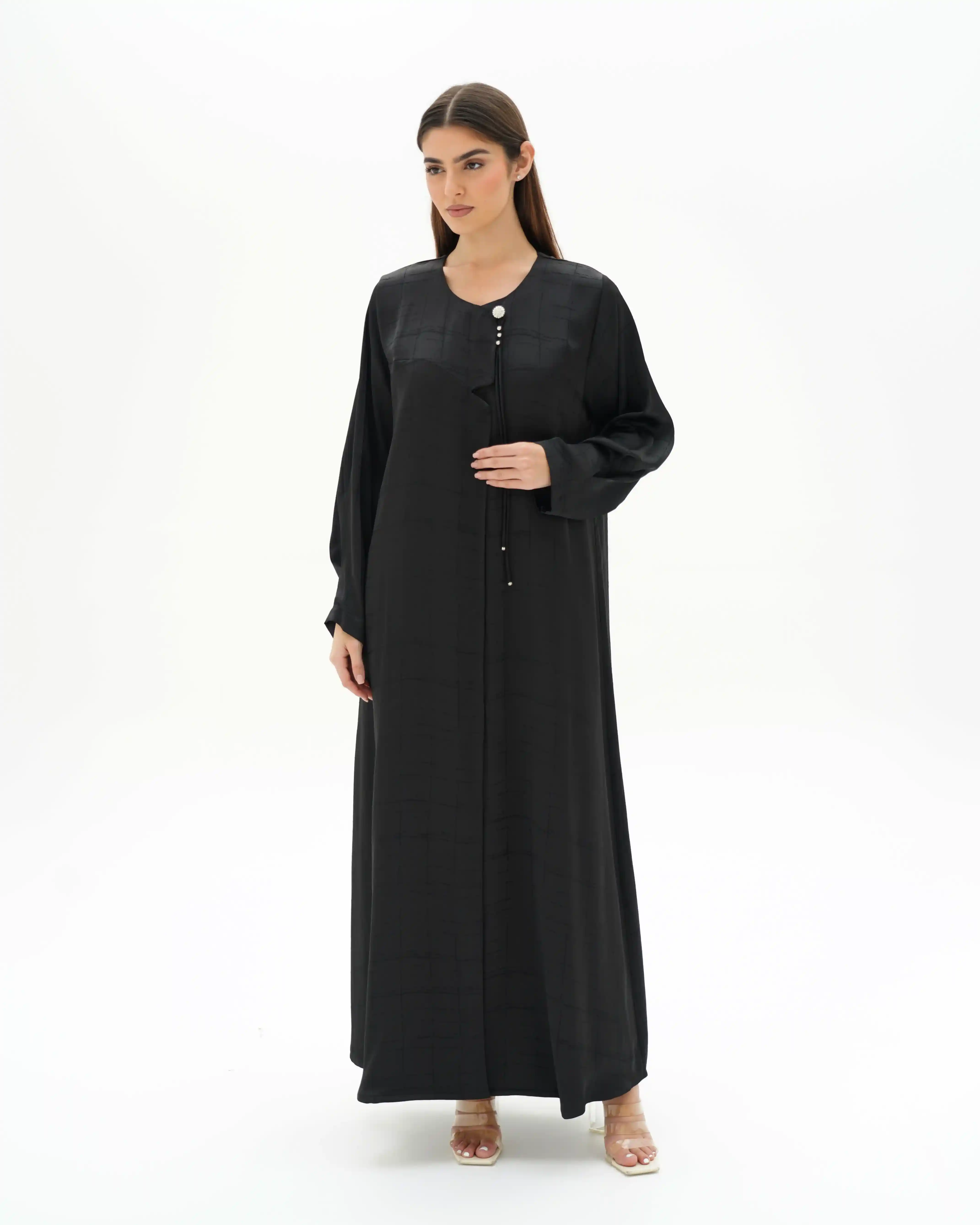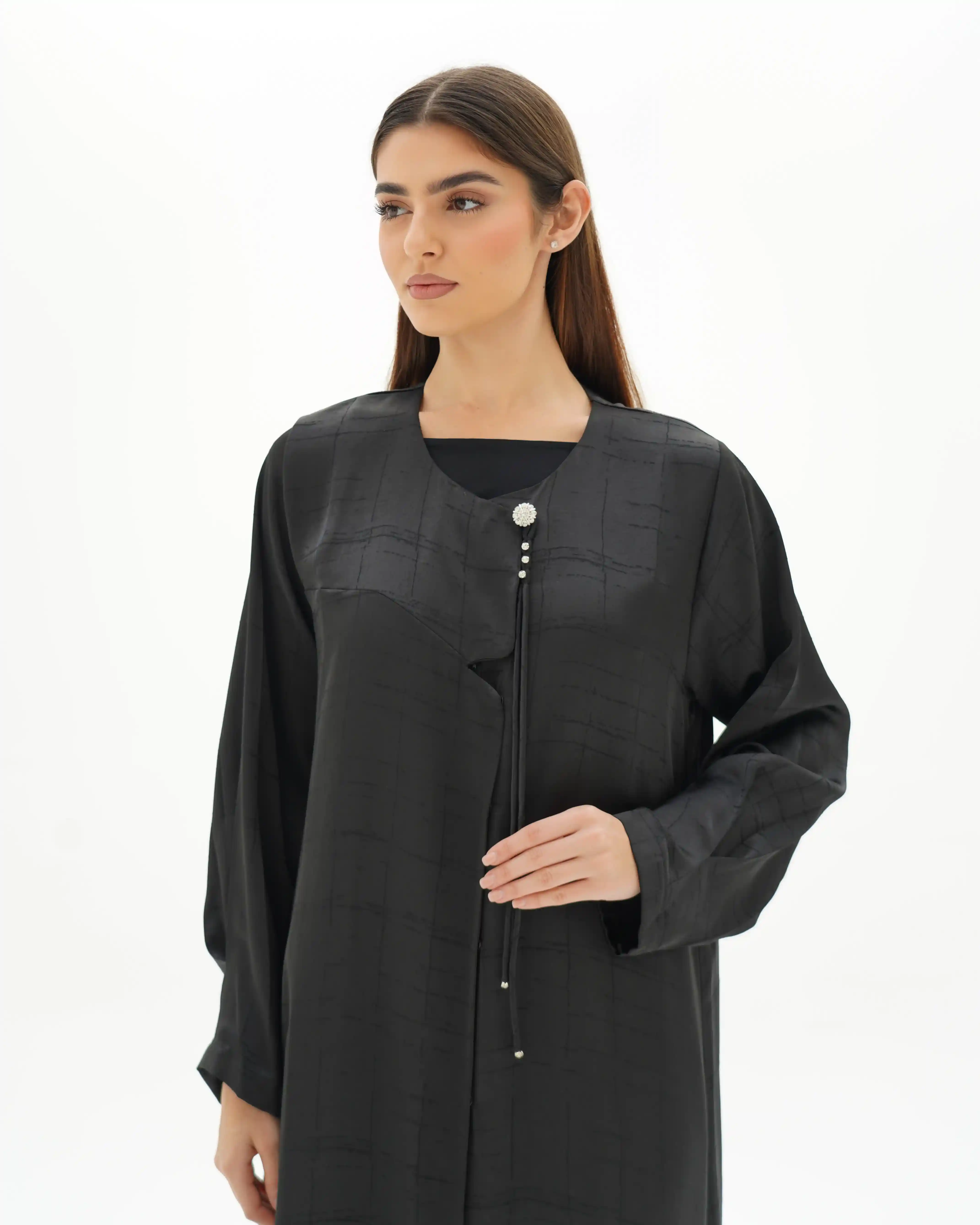 عباية تنسدل بقصّة مستقيمة، من قماش كروسفيل جاكارد بملمس ناعم وانسدال متزن يوازن بين الخفة والفخامة. يأتي الإغلاق الأمامي بطقطق كامل مخفي ليحافظ على نقاء الخط الأمامي، بينما يتوسط الصدر ثنية ناعمة تضيف بُعدًا بصريًا هادئًا. تتزّين الياقة باشتغال فاخر من زركون والكريستال بتكوين دائري متناغم، يتصل بحزام منسدل مرصّع في بدايته بثلاث خرزات فضية تتوسطها كرستالة بيضاء، على امتداده بعُقد دقيقة، وينتهي بتفصيل خرزي فضي يمنحه لمسة لامعة محسوبة. الأكمام بثنيات مدروسة. وتكتمل الإطلالة بطرحة متناغمة مزدانة بخمس لآلئ مستوحاة من تفاصيل الياقة والحزام المنسدل، لتجسّد تناغمًا متكاملًا في التفاصيل.