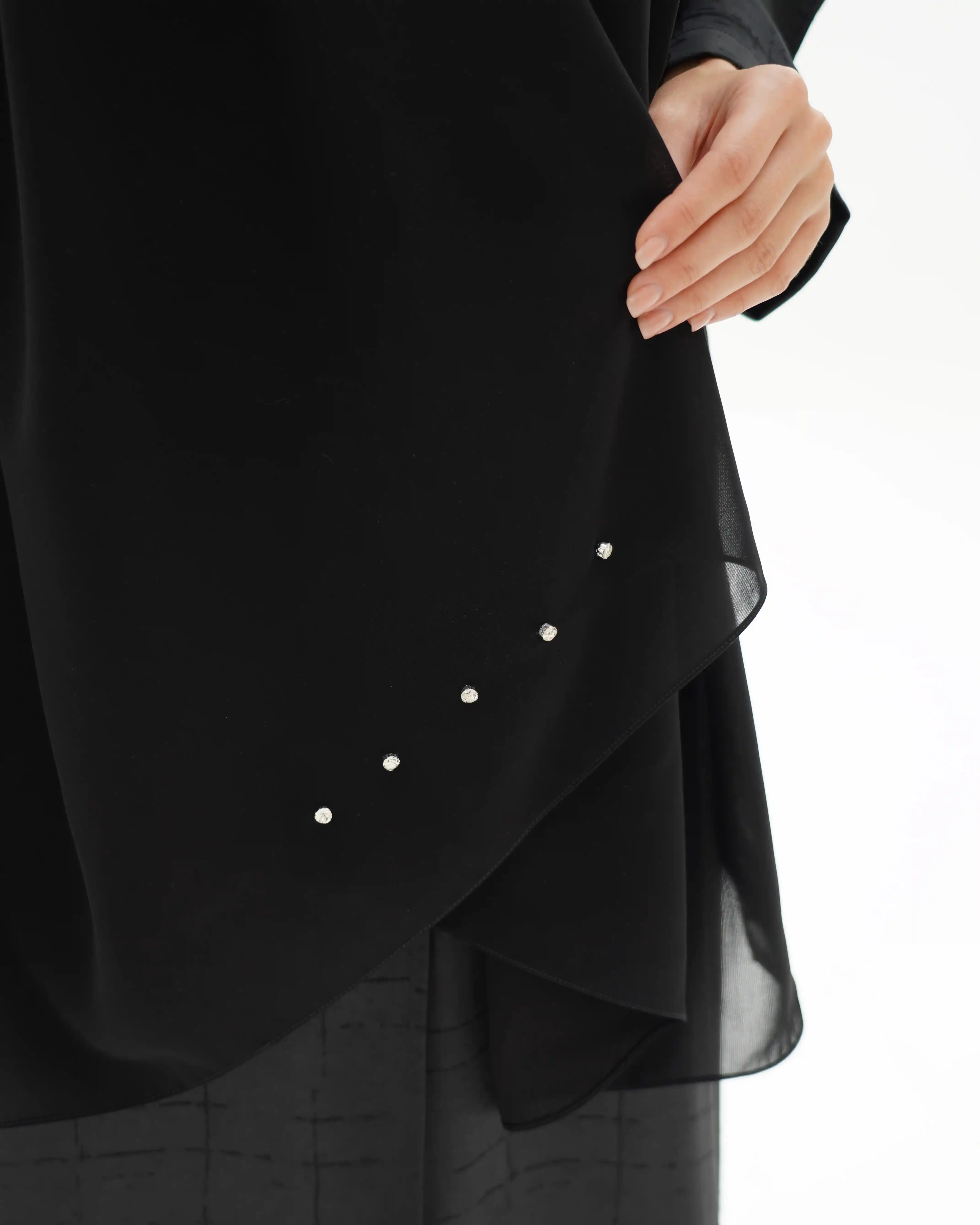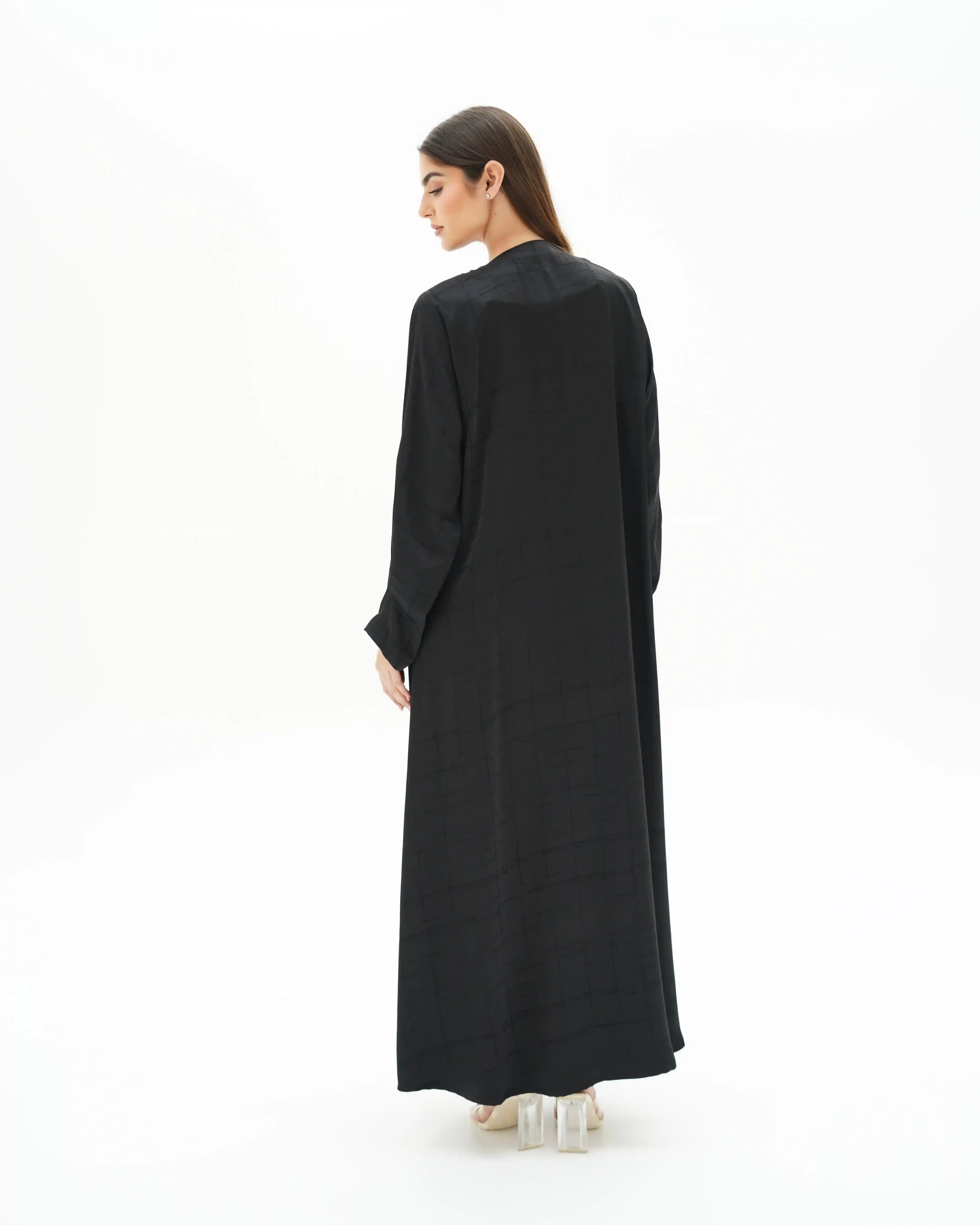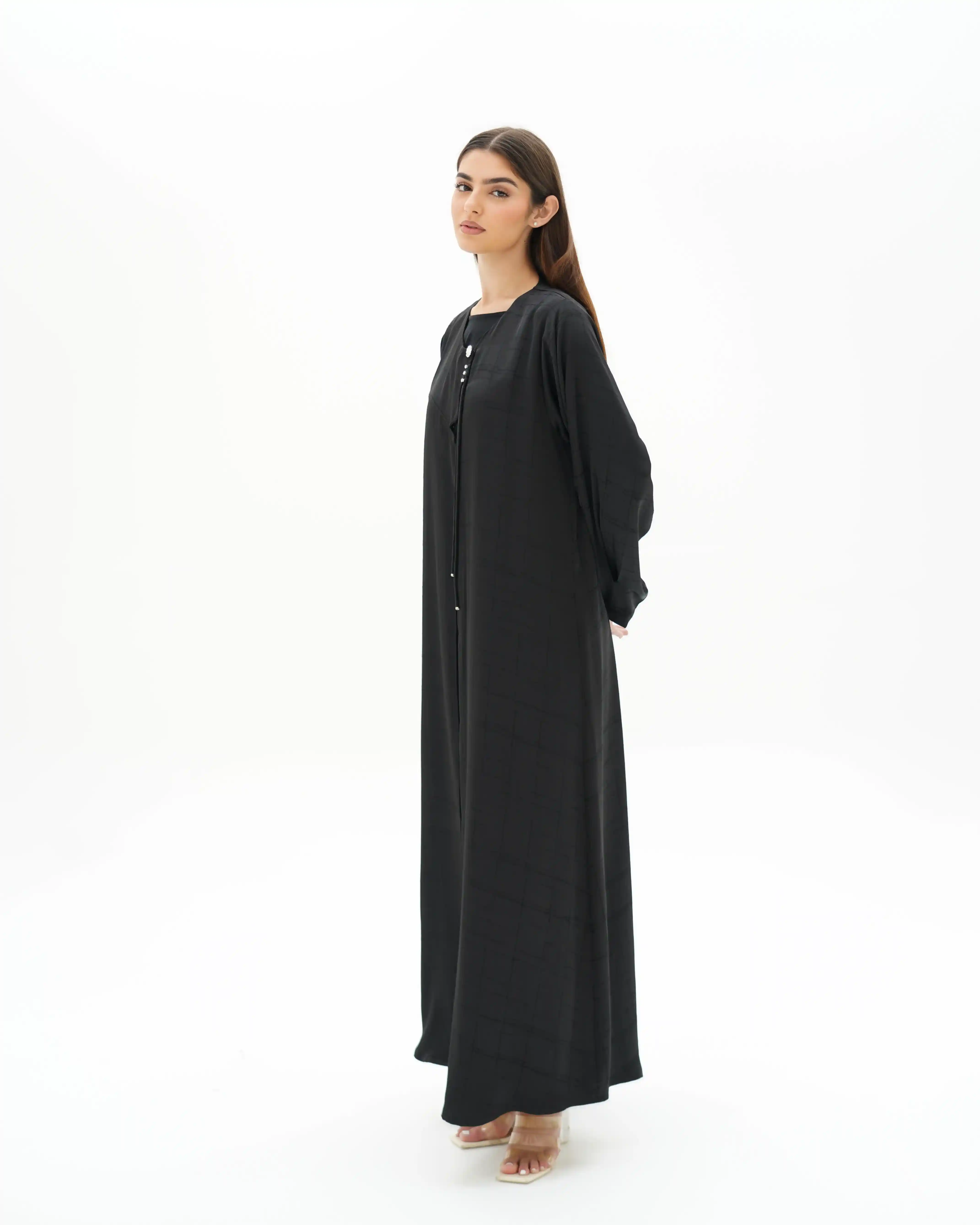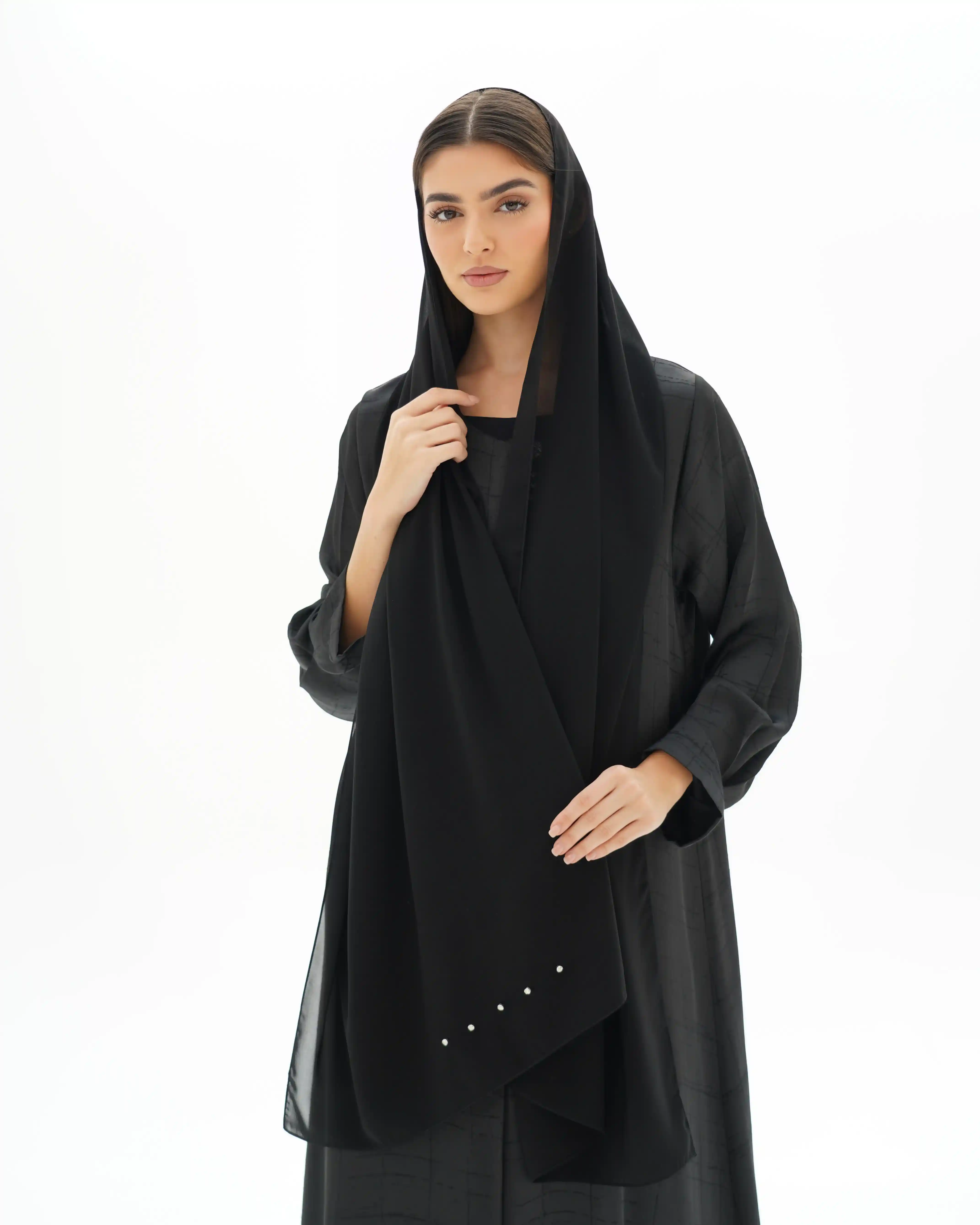 عباية تنسدل بقصّة مستقيمة، من قماش كروسفيل جاكارد بملمس ناعم وانسدال متزن يوازن بين الخفة والفخامة. يأتي الإغلاق الأمامي بطقطق كامل مخفي ليحافظ على نقاء الخط الأمامي، بينما يتوسط الصدر ثنية ناعمة تضيف بُعدًا بصريًا هادئًا. تتزّين الياقة باشتغال فاخر من زركون والكريستال بتكوين دائري متناغم، يتصل بحزام منسدل مرصّع في بدايته بثلاث خرزات فضية تتوسطها كرستالة بيضاء، على امتداده بعُقد دقيقة، وينتهي بتفصيل خرزي فضي يمنحه لمسة لامعة محسوبة. الأكمام بثنيات مدروسة. وتكتمل الإطلالة بطرحة متناغمة مزدانة بخمس لآلئ مستوحاة من تفاصيل الياقة والحزام المنسدل، لتجسّد تناغمًا متكاملًا في التفاصيل.