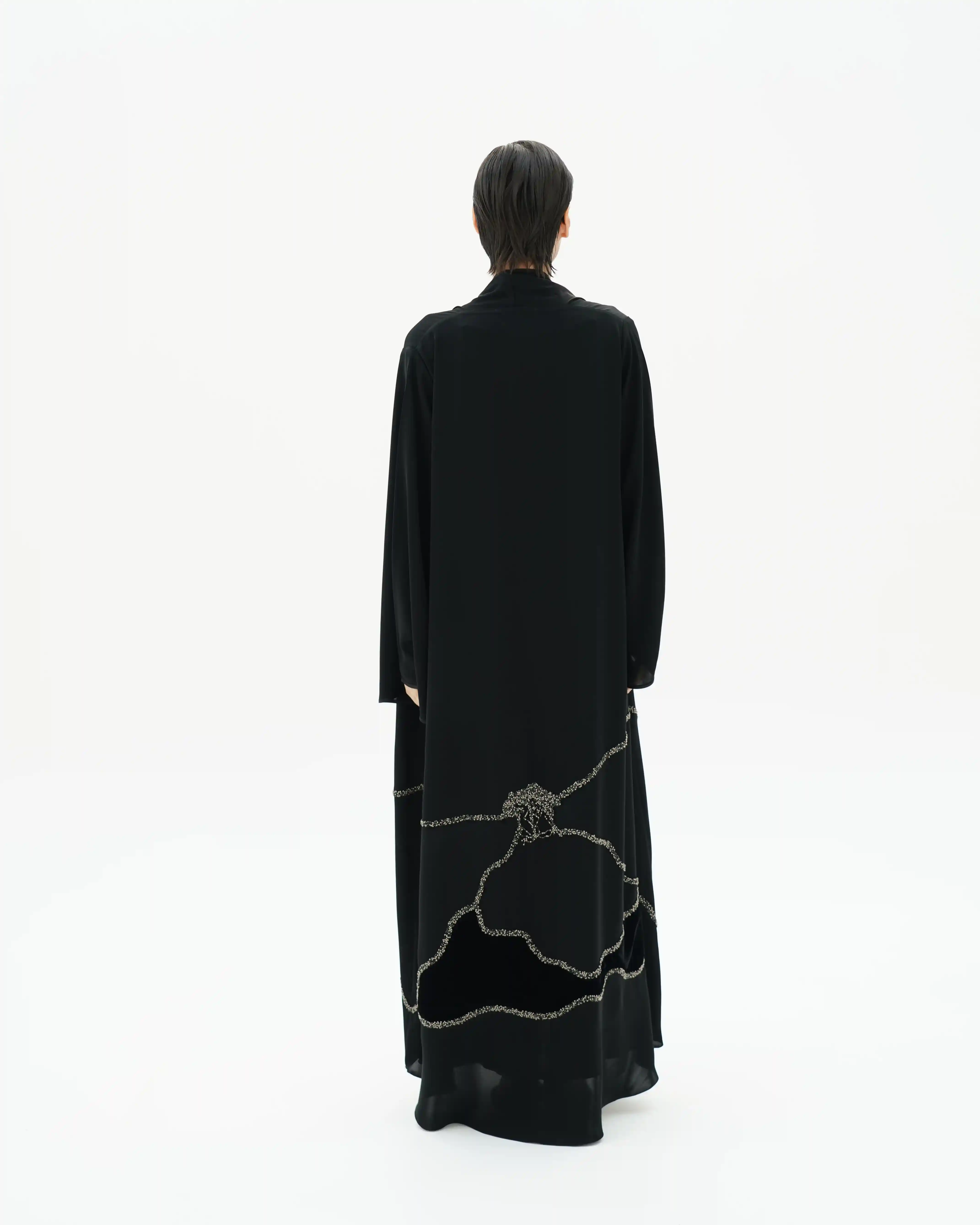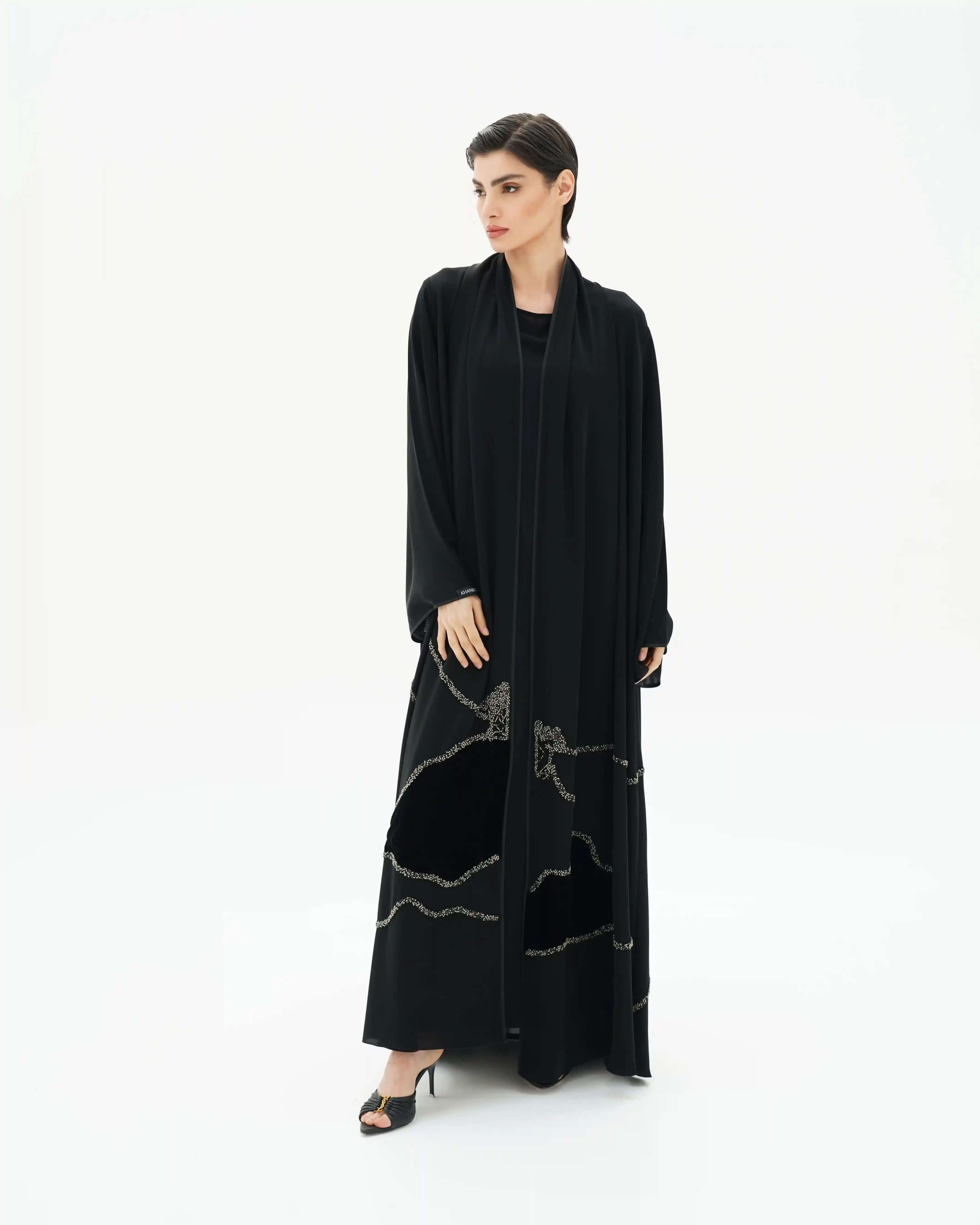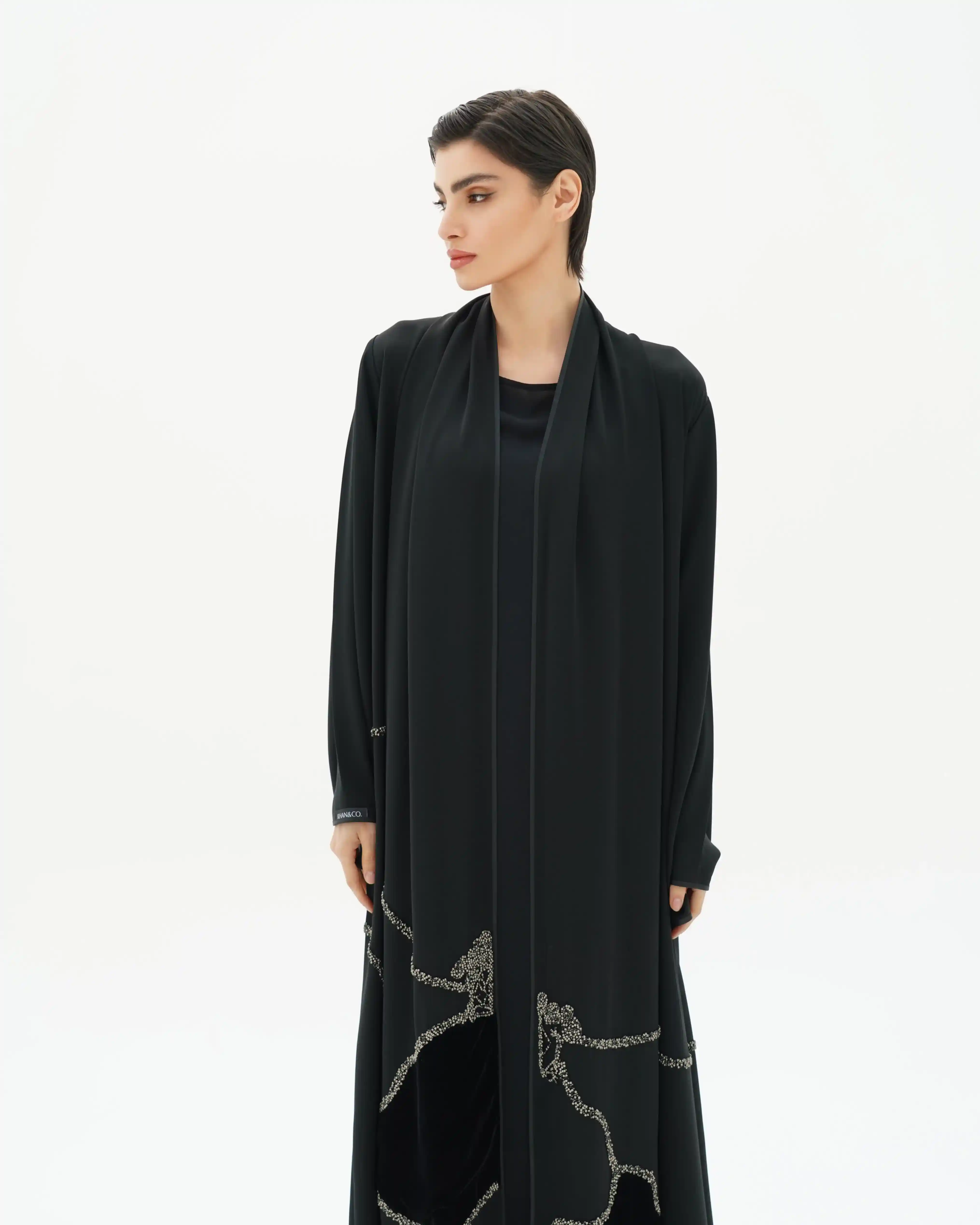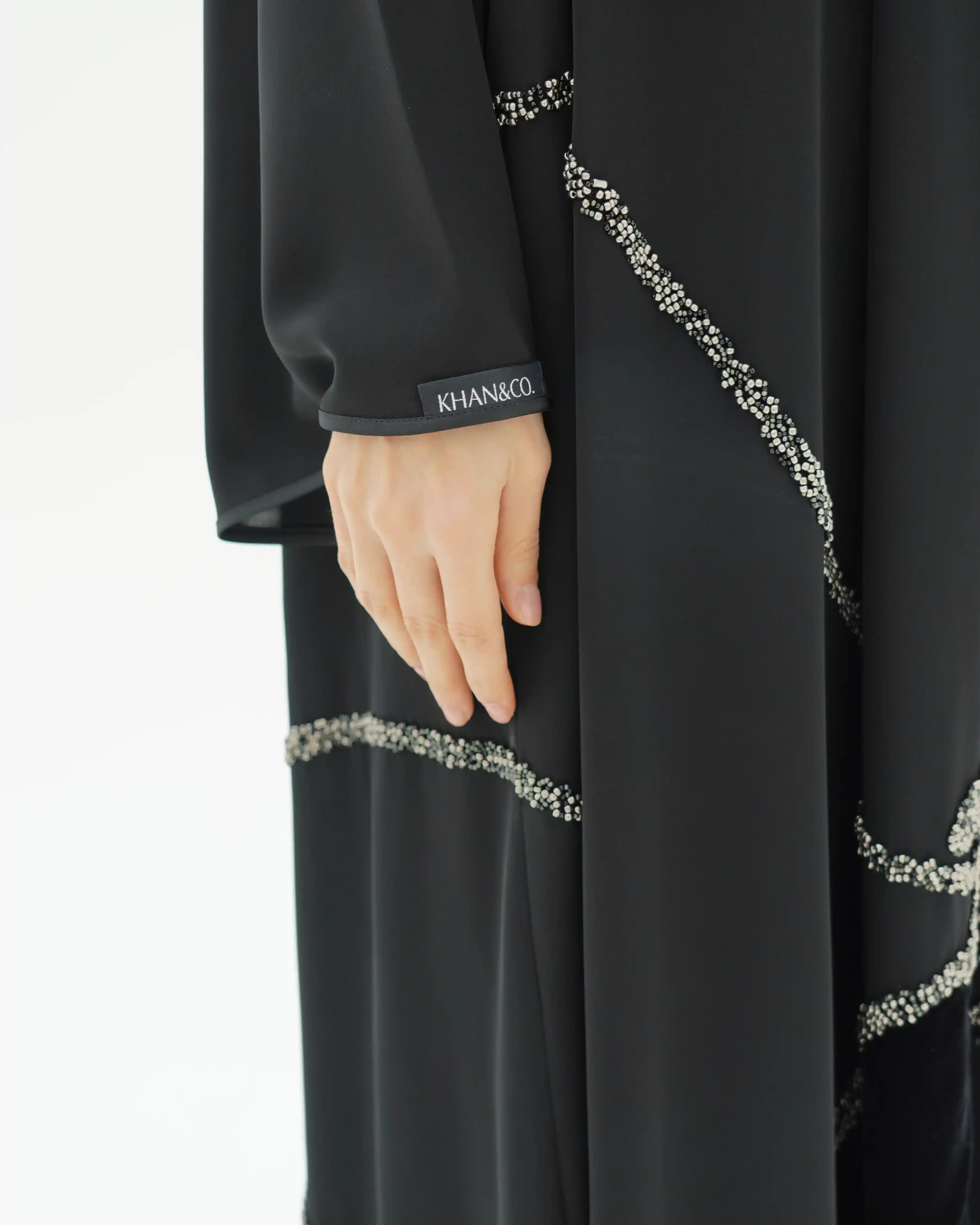 عباية بتصميم معاصر تعيد ابتكار مفهوم العباية اللف بأسلوب مختلف، من قماش البريميوم كريب بانسدال ناعم وحركة هادئة. يتميّز الجزء العلوي بثنيات دقيقة عند مقدمة الأكتاف تمنح مساحة قماش مدروسة تسمح بإغلاق العباية من الأمام بشكل كامل وساتر، مع تصميم التفاف ذكي من خلف الرقبة يمنح إيحاء الشال أو الإسكارف بانسيابية راقية. الجزء السفلي يأتي أكثر ثراءً عبر اشتغال يدوي بالخرز المدمج يدويا بالمخمل، بتوزيع متوازن يضيف عمقًا بصريًا هادئًا دون إخلال بنقاء التصميم. الأكمام انسيابية بطابع نظيف، وتكتمل الإطلالة بطرحة من نفس لون العباية مطرّزة بخرز منثور على طرفيها، في توقيع يعكس هوية .KHAN&CO الهادئة بروح دار أزياء عالمية.