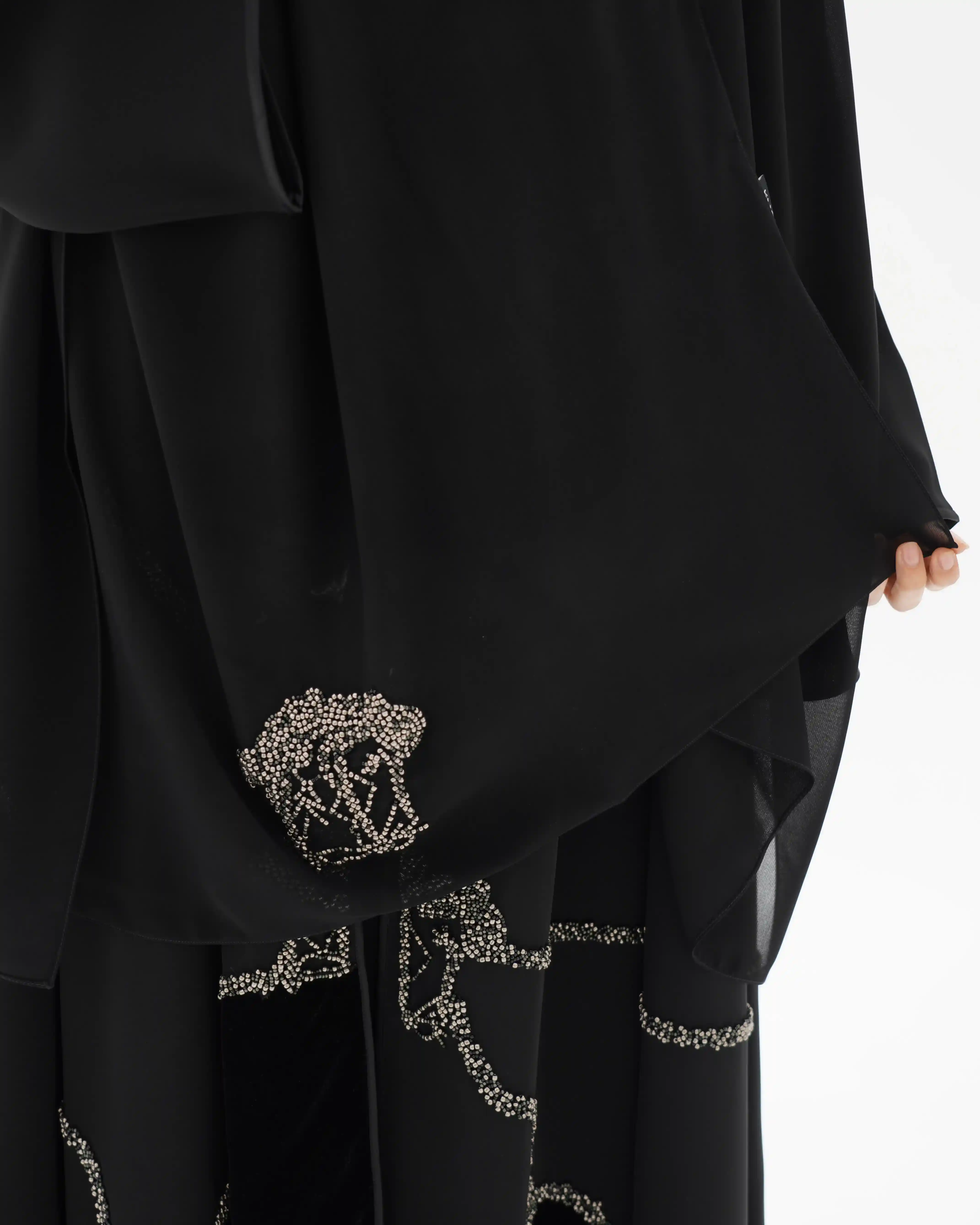قماش البريميوم كريب بقصة لف ساترة مشتغلة يدويا بالخرز والمخمل